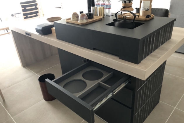 男性用の休憩室として作ったこちらは、円形建物に合わせて製作したカウンターテーブルです。